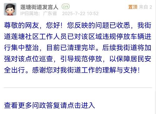 尊敬的网友,您好!您反映的问题已收悉,我街道莲塘社区工作人员已对该区域违规停放车辆进行集中整治,目前已清理完毕。后续我街道将加强对该点位巡查,引导规范停放,以保障居民安全出行。感谢您对我街道工作的理解与支持!