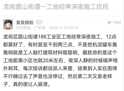 11. 帖文《龙岗圆山街道一工地经常深夜施工扰民》