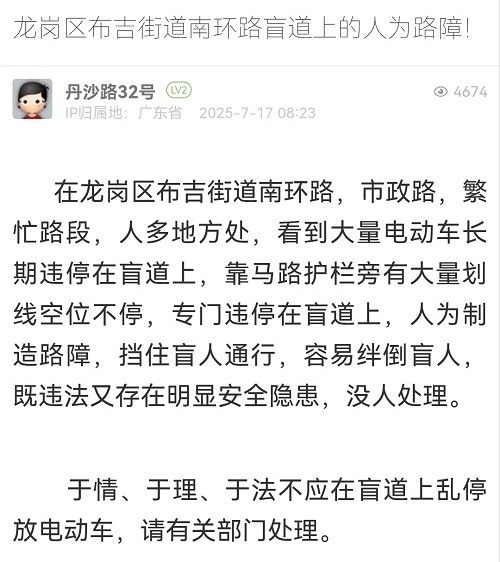 14. 帖文《龙岗区布吉街道南环路盲道上的人为路障!》