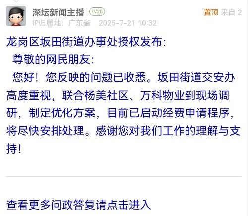 各职能单位如需对网友反映的问题进行回应,可在深圳论坛注册官方账号并通过认证,回帖进行回应。