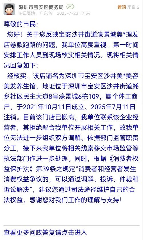 39. 帖文《宝安沙井街道濠景城美*理发店卷款跑路》