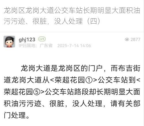 3. 帖文《龙岗区龙岗大道公交车站长期明显大面积油污污迹、很脏,没人处理(四)》
